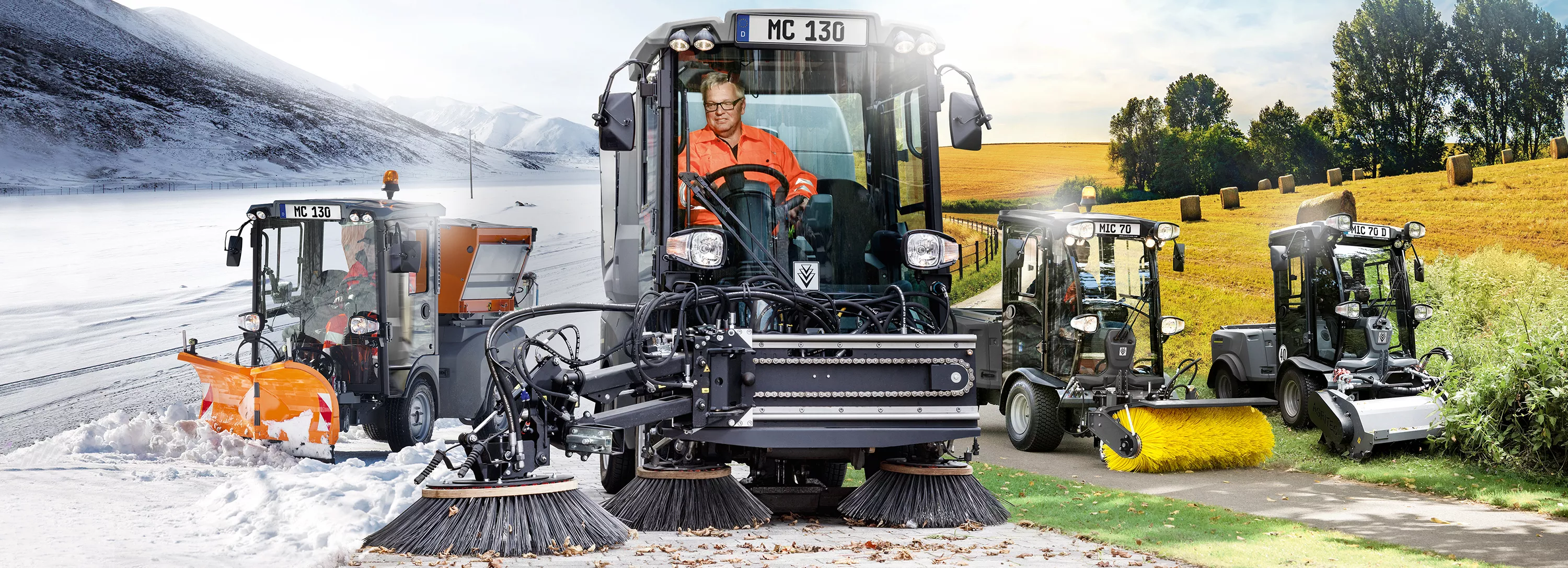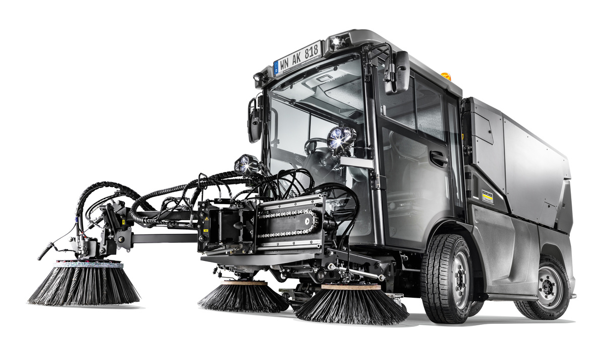 Komunalne zamiatarki i nośniki narzędzi Kärcher mogą pracować przez cały rok zamiatając, kosząc, myjąc i odśnieżając w zależności od panujących warunków.